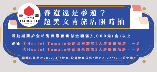- 凡於活動期間內消費,全站消費累積實付金額滿3000元(含)以上,即有機會抽中Hostel Tomato 番茄溫泉旅店雙人房。 共計兩名,每人限參加乙次。(限平日兌換)