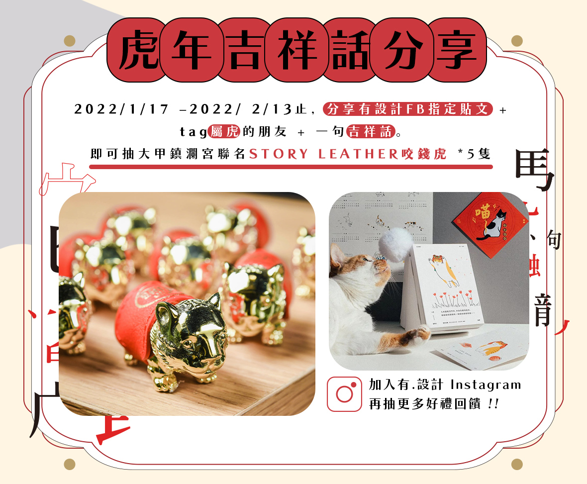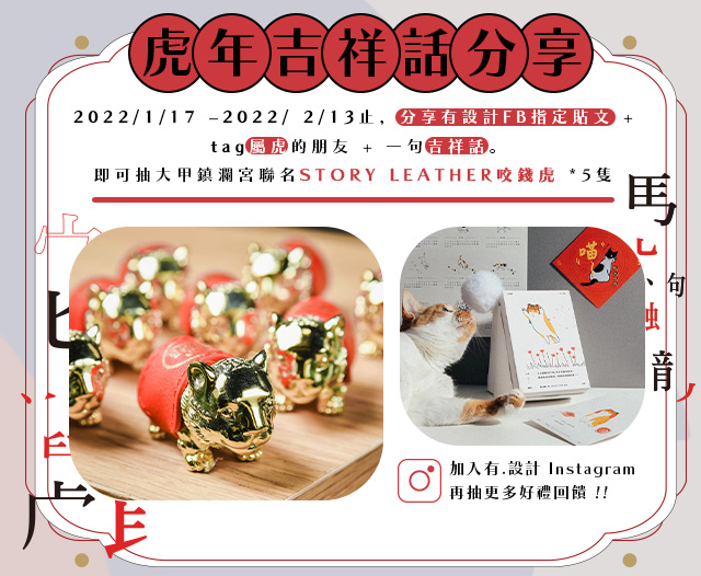 - 活獎項將於2022/3/7(一)於有.設計官方臉書公告,得獎者須於公告後三日內(3/10日前)私訊小編得獎人收件資料(姓名、地址含郵遞區號5碼、電話)。
